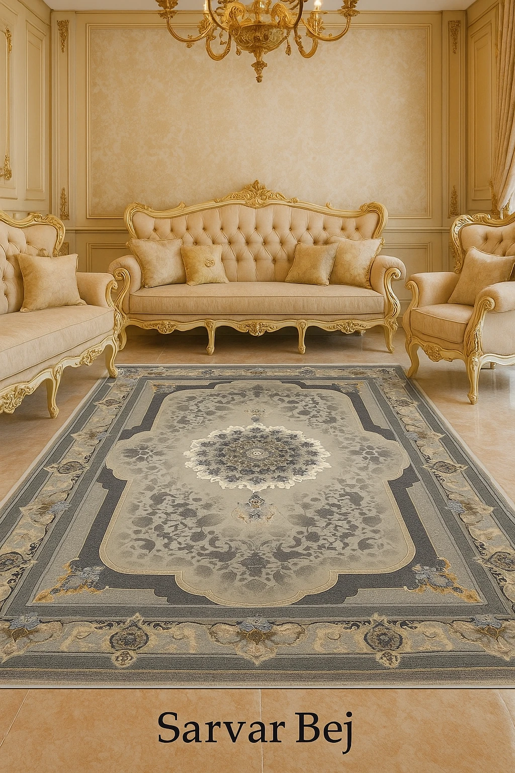 فرش سرور نقره ای دودی سرمه ای بژ| ۷۰۰ شانه کاشان با نخ آلمانی هیتست و دستگاه بافت بلژیکی