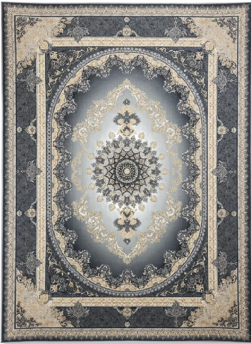 فرش کارن سرمه ای نقره ای دودی بژ| ۷۰۰ شانه کاشان با نخ آلمانی هیتست و دستگاه بافت بلژیکی