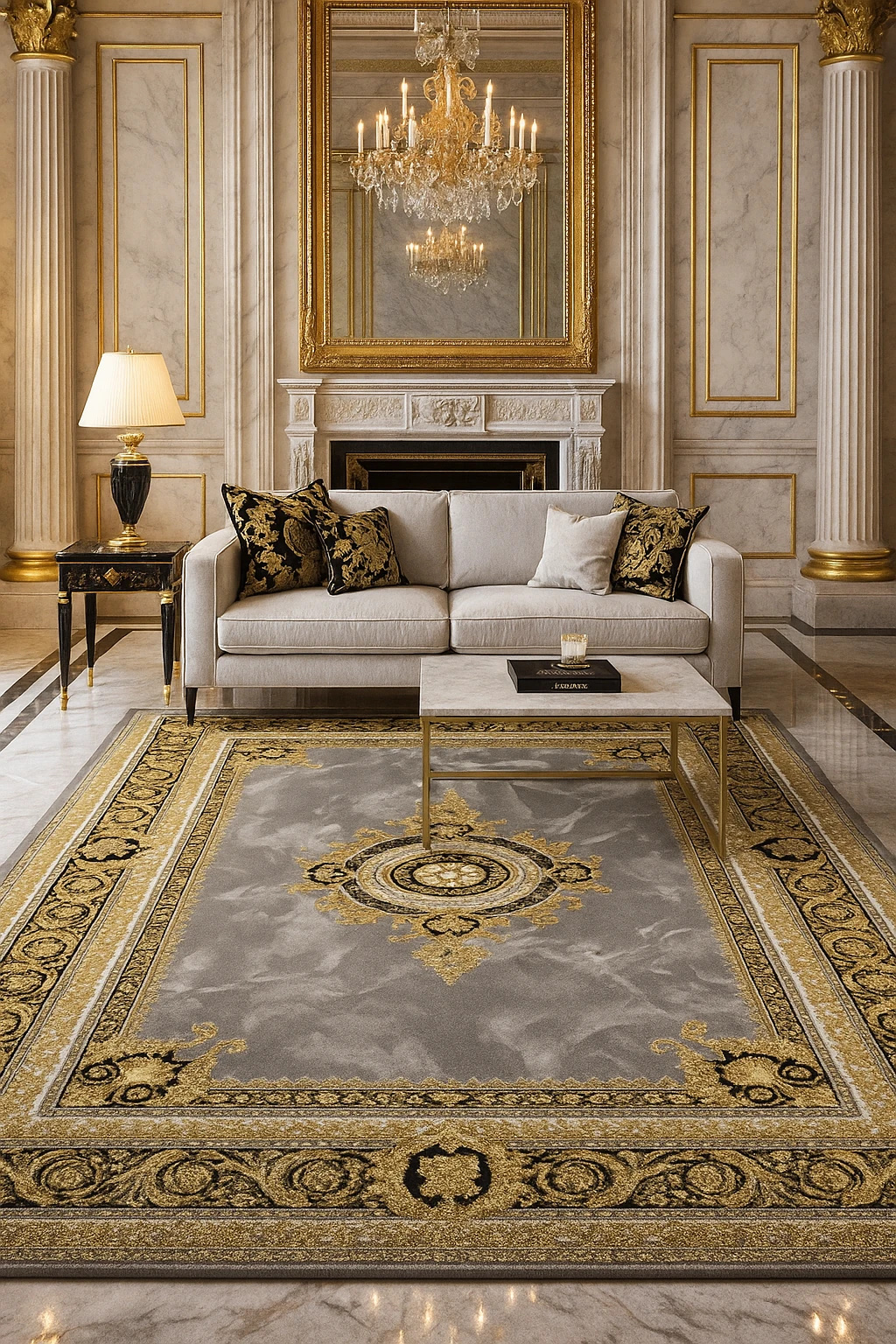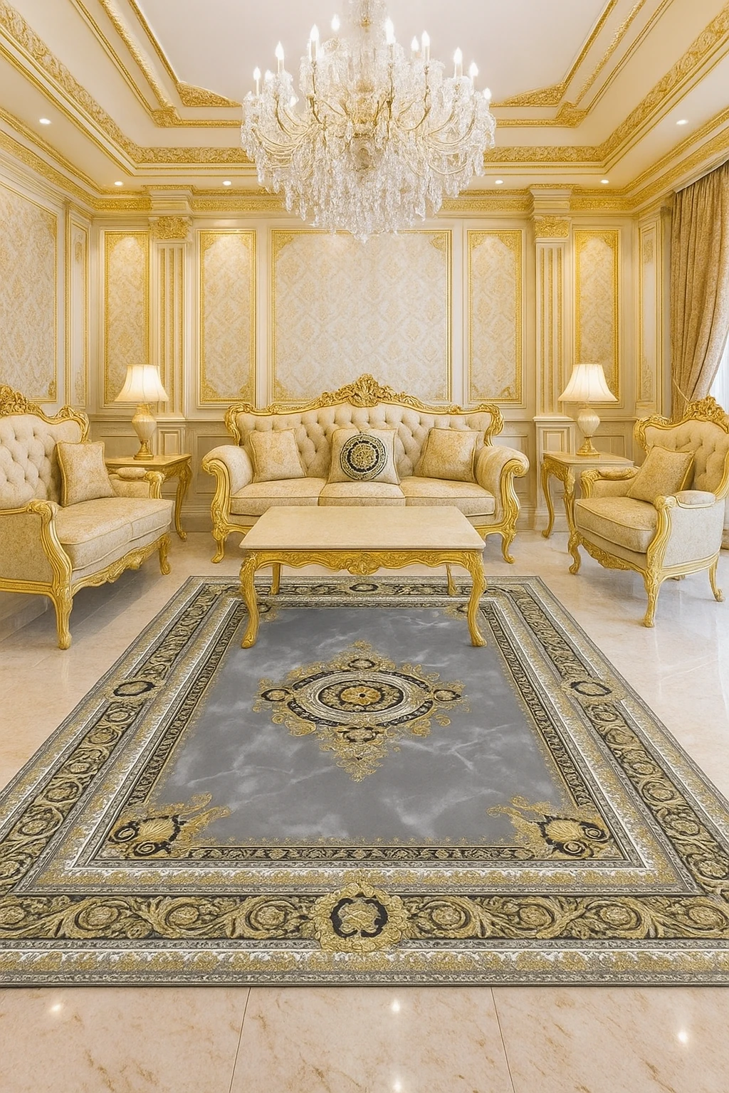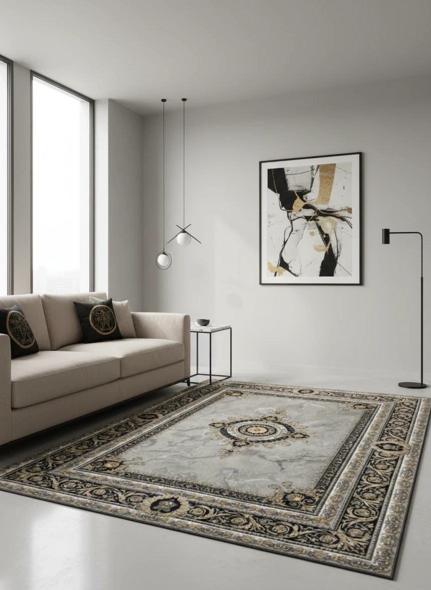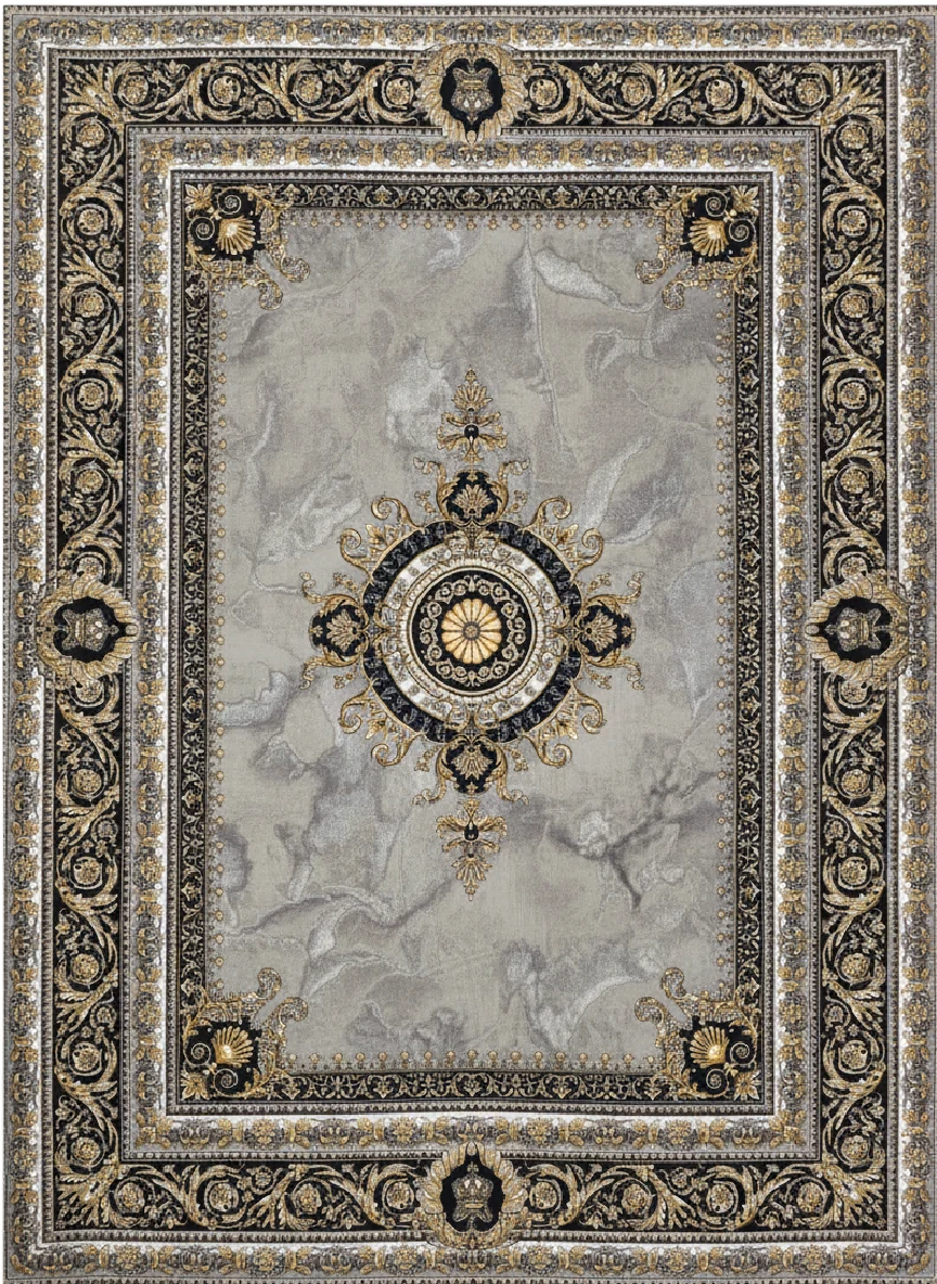 فرش ورساچه یکی از لوکسترین و سلطنتیترین طرحهای بازار فرش کاشان است؛ این مدل با الهام از استایل اورجینال Versace Royal طراحی شده و با حاشیههای باروک طلایی، مدالیون مرکزی شاهانه و پسزمینه سنگی–ابر و بادی، جلوهای بسیار اشرافی و خاص دارد.