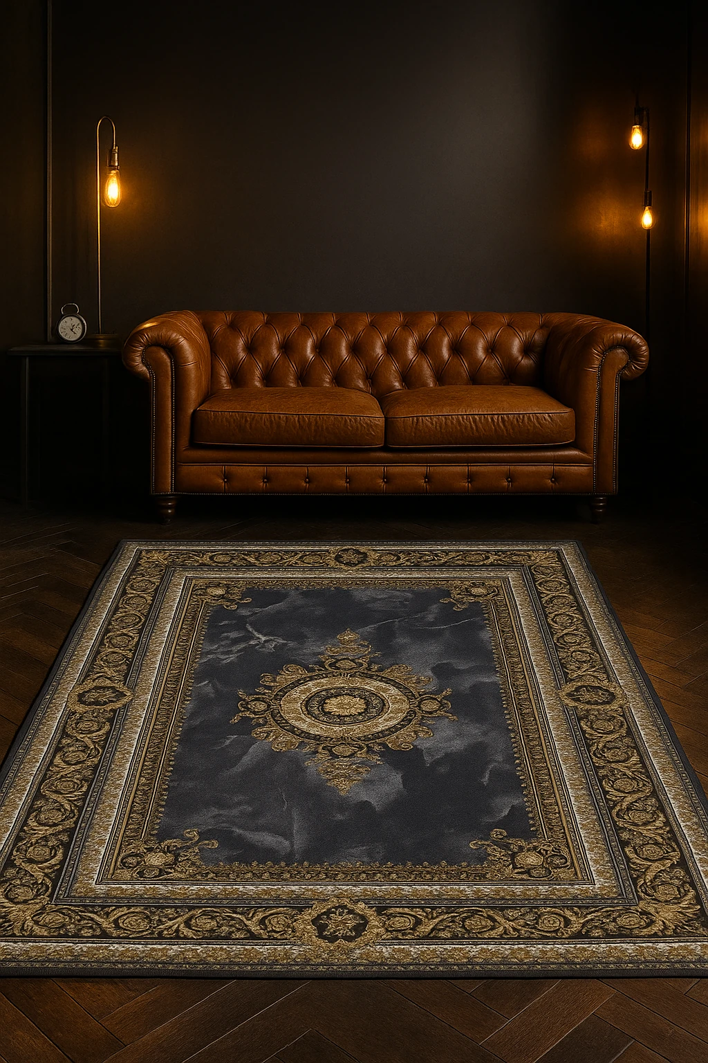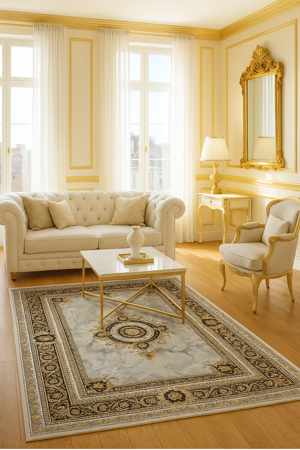 فرش با نخ آلمانی اکریلیک هیتستشده (بدون پرز، مقاوم و مات–درخشان) و توسط دستگاه فوقدقیق HCX بلژیکی بافته میشود؛ همین موضوع باعث میشود خطوط طلایی، موتیفهای باروک و سایهروشنهای سنگی با وضوحی فوقالعاده دیده شوند.