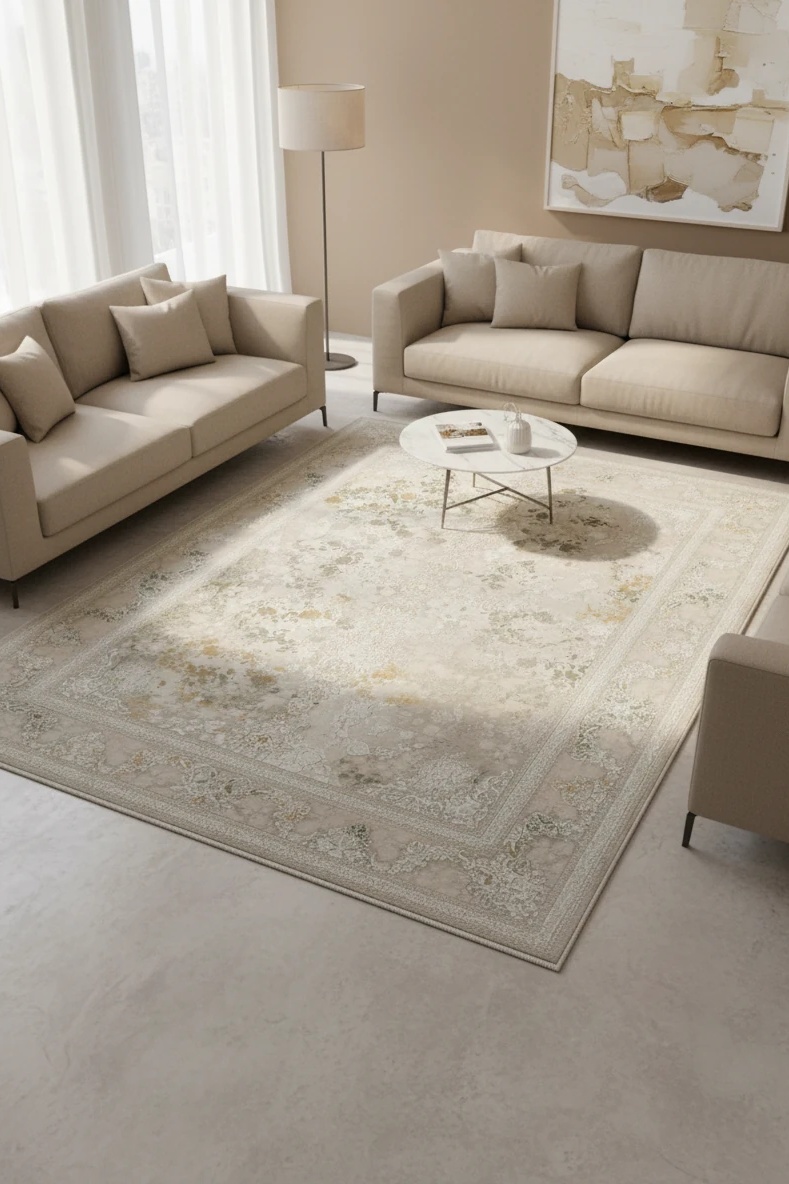 فرش افشان درخشش کاشان با نخ آلمانی هیتست و بافت بلژیکی، پرزدهی کم، طرح افشان ظریف و رنگبندی سیلور و گلد دارد و گزینهای عالی برای فضاهای شیک و امروزی است.