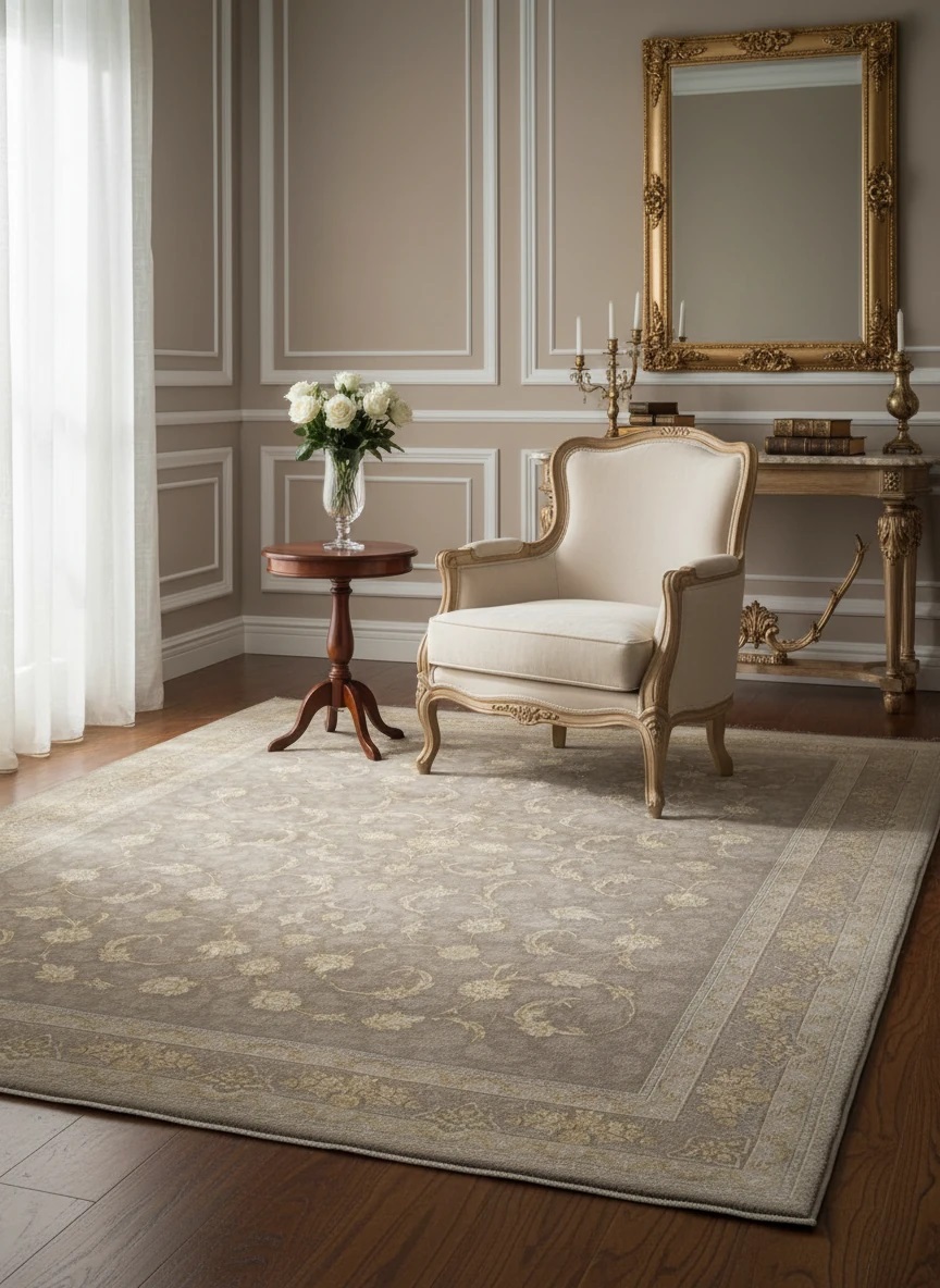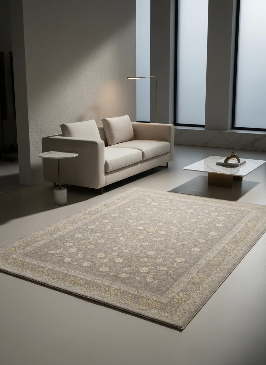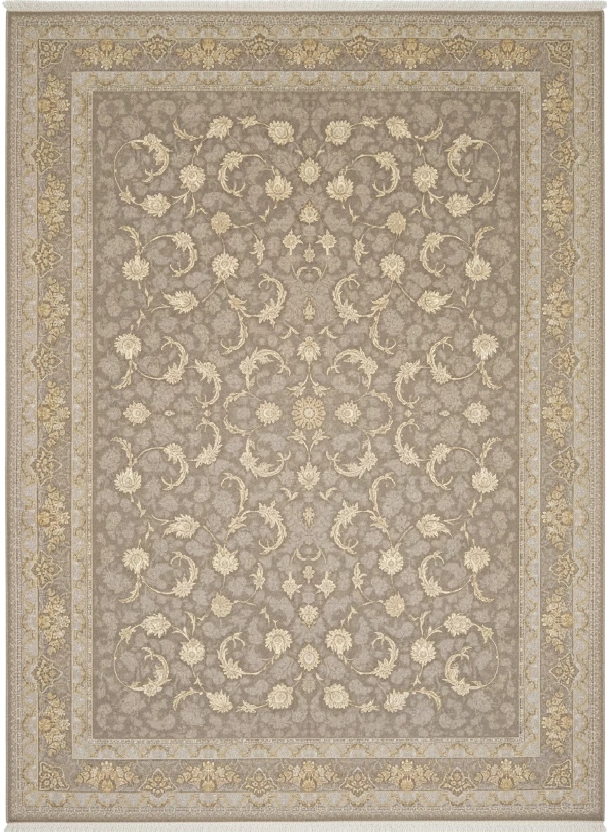 فرش افشان صدف کاشان | نقرهای و بژ، 1200 شانه هیت ست با بافت بلژیکی
