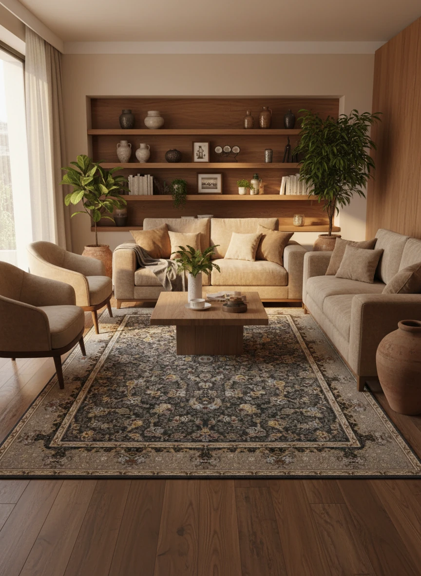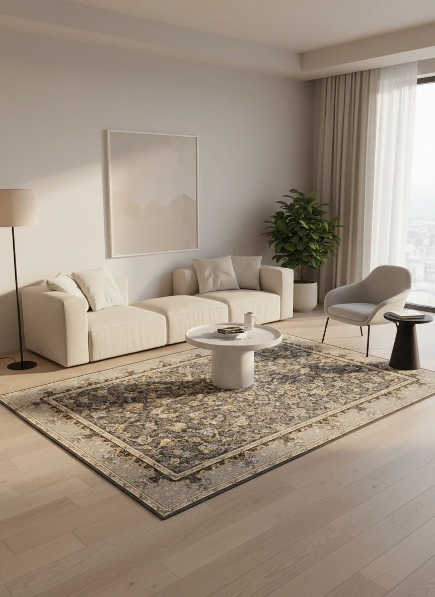 با مبلمان کرم، نقرهای و خاکستری کاملاً هارمونی بصری طبیعی ایجاد میکند و اگر نورپردازی مدرن (LED سفید یا زرد ملایم) بالای آن باشد، طرح افشان رز مانند تابلویی درخشان خودنمایی میکند.