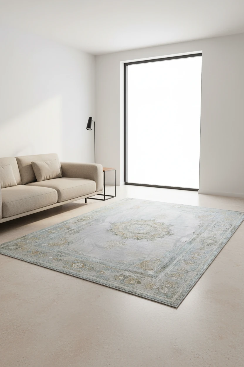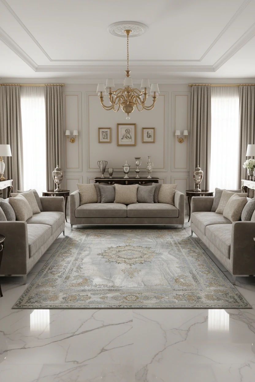 فرش برسین کاشان 1200 شانه با تراکم 3600، با نخ آلمانی هیت ست و بافت بلژیکی تولید شده؛ کمپرز، بادوام و بسیار شیک، مناسب پذیراییهای لوکس در رنگهای نقرهای و بژ.