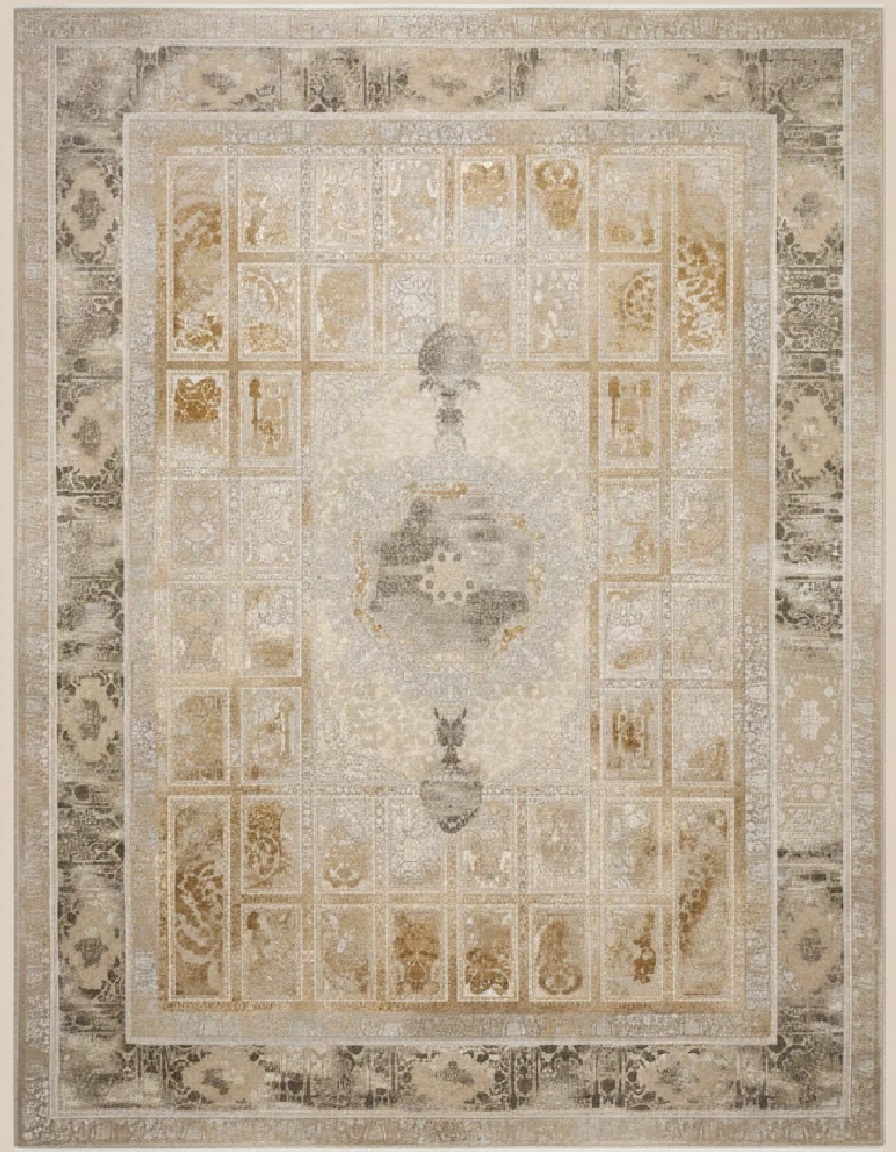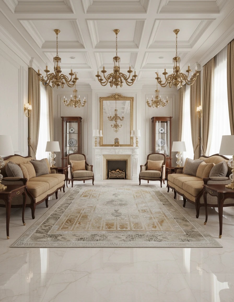 فرش خرنج کاشان 1200 شانه با تراکم 3600، تولیدشده با نخ آلمانی هیت ست و دستگاه بافت بلژیکی؛ کمپرز، بادوام و خاص، مناسب دکوراسیونهای لوکس در رنگهای نقرهای و بژ.