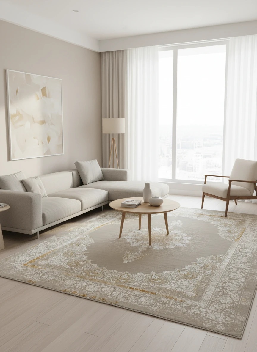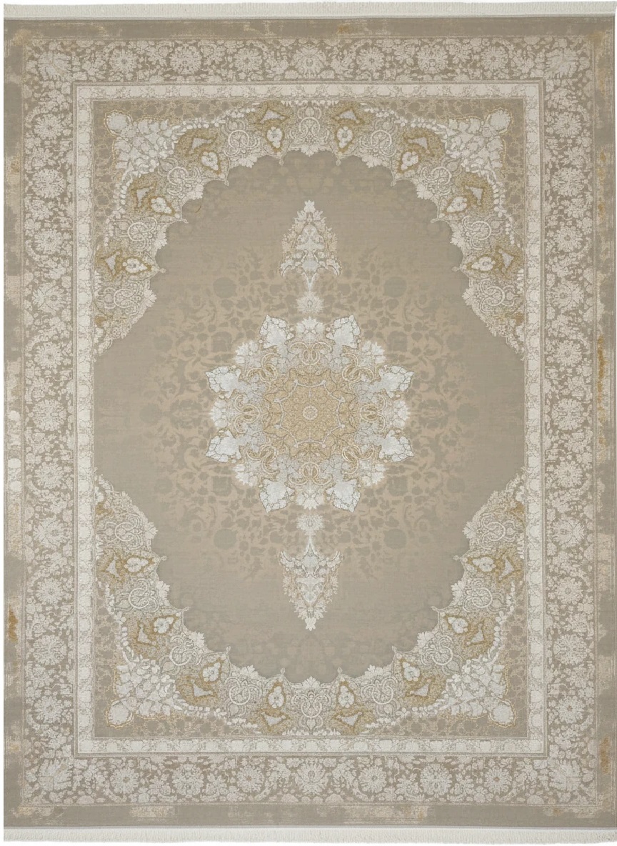 فرش یاقوت کاشان | نقرهای و بژ، 1200 شانه با نخ آلمانی هیت ست