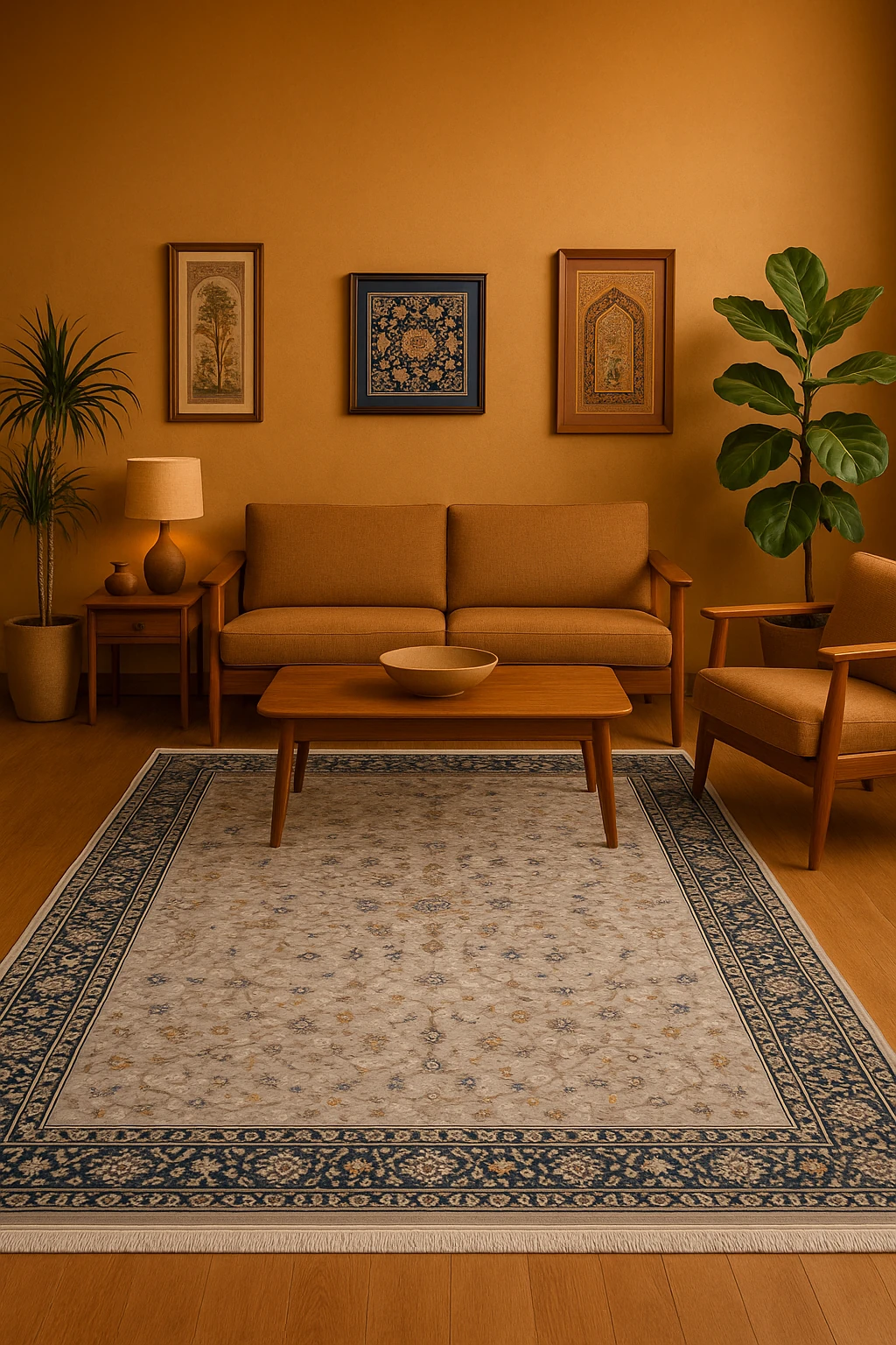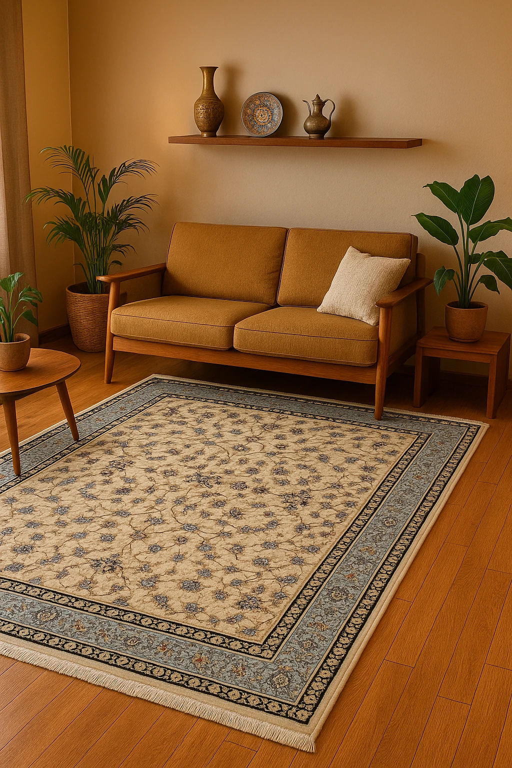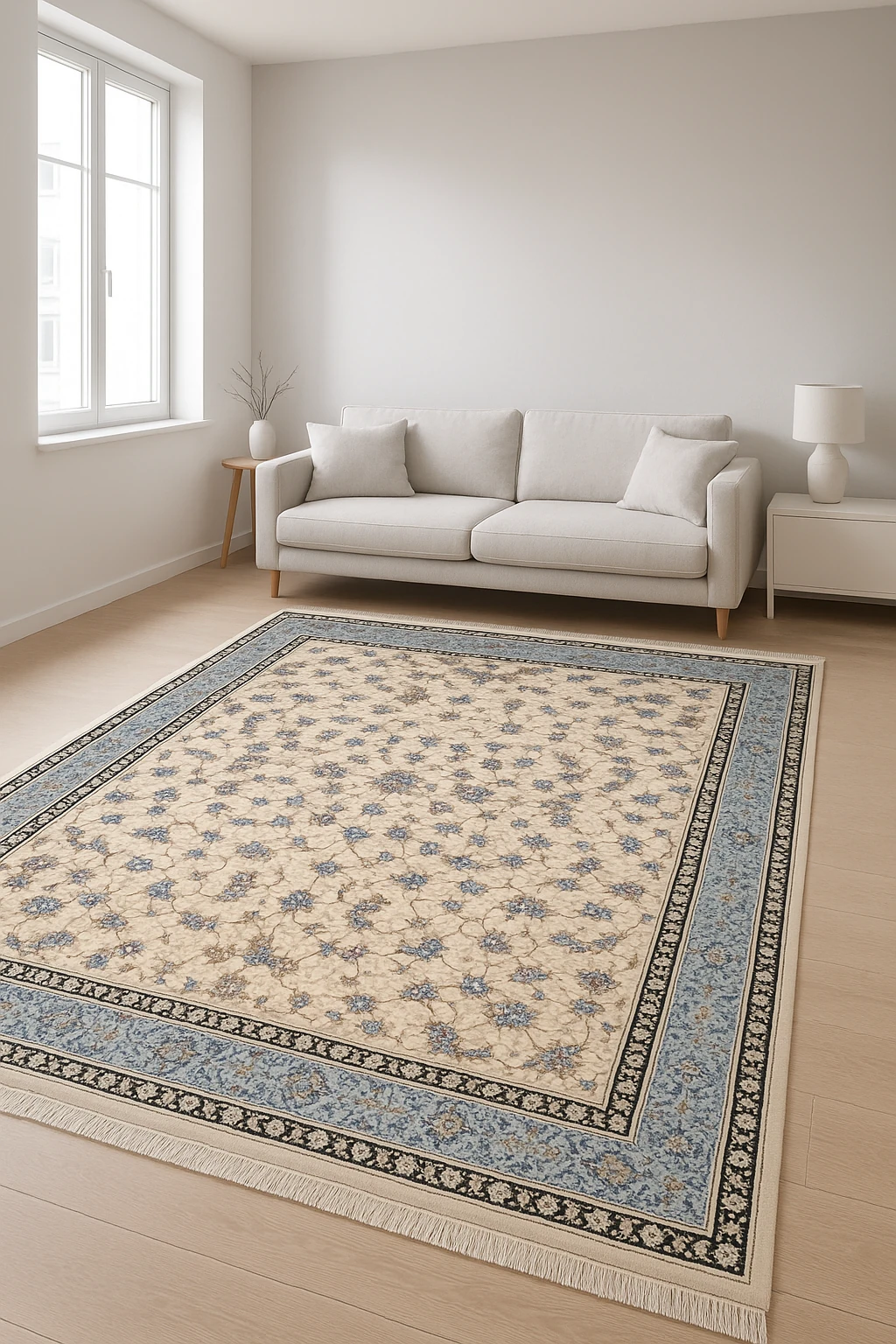 زمینهی نقرهای و بژ این فرش با گلهای رز صورتی، آبی و طلایی، حسی از آرامش و روشنایی در فضا ایجاد میکند و طرح افشان بدون ترنج، جلوهای مدرن و منسجم به دکور خانه میبخشد.