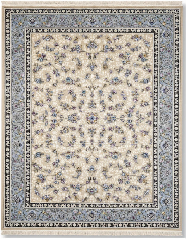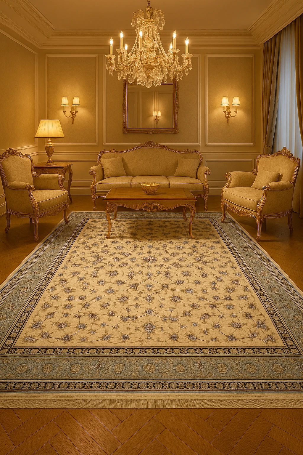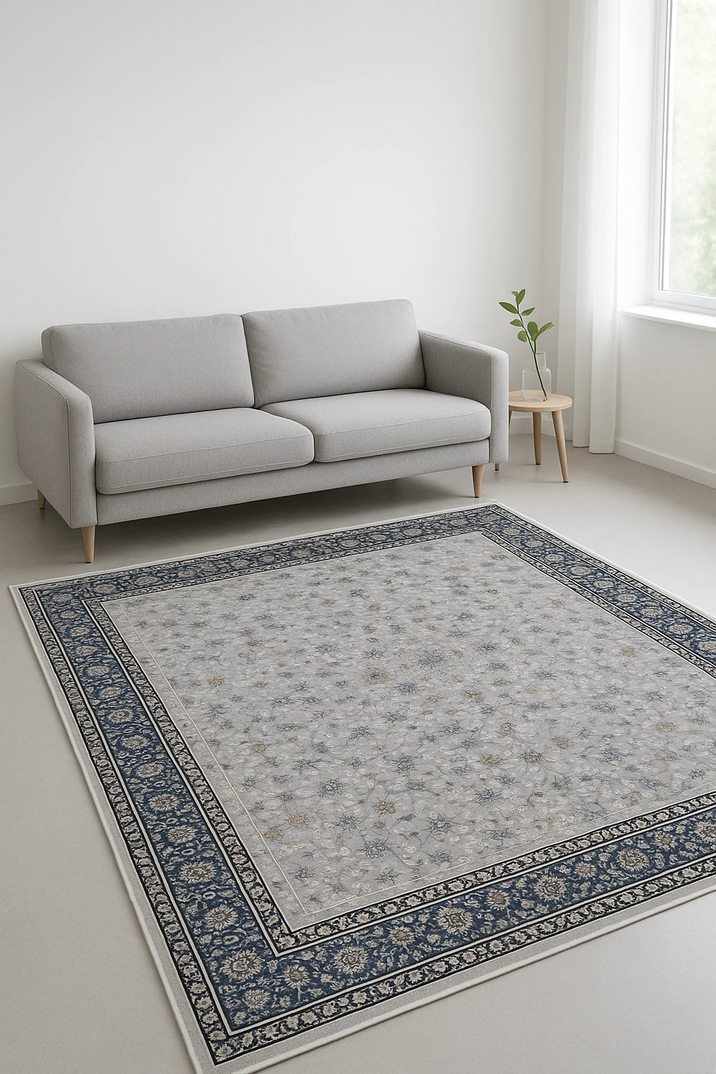 زمینهی نقرهای و بژ این فرش با گلهای رز صورتی، آبی و طلایی، حسی از آرامش و روشنایی در فضا ایجاد میکند و طرح افشان بدون ترنج، جلوهای مدرن و منسجم به دکور خانه میبخشد.